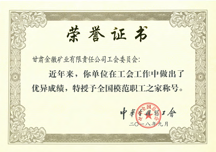 近日,金徽股份工會榮獲“模范職工之家”榮譽(yù)稱號,這是繼金徽股份榮獲全國首批綠色工廠,入選國家級綠色礦山名錄之后獲得的又一項(xiàng)國家榮譽(yù)。